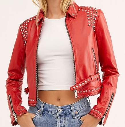 Women's New Custom Made Red Leather Silver Studded Zipper Style Real Cowhide Leather Jackets