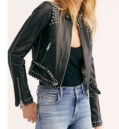 Women's New Custom Made Black Leather Silver Studded Zip up Style Real Cowhide Leather Jacket
