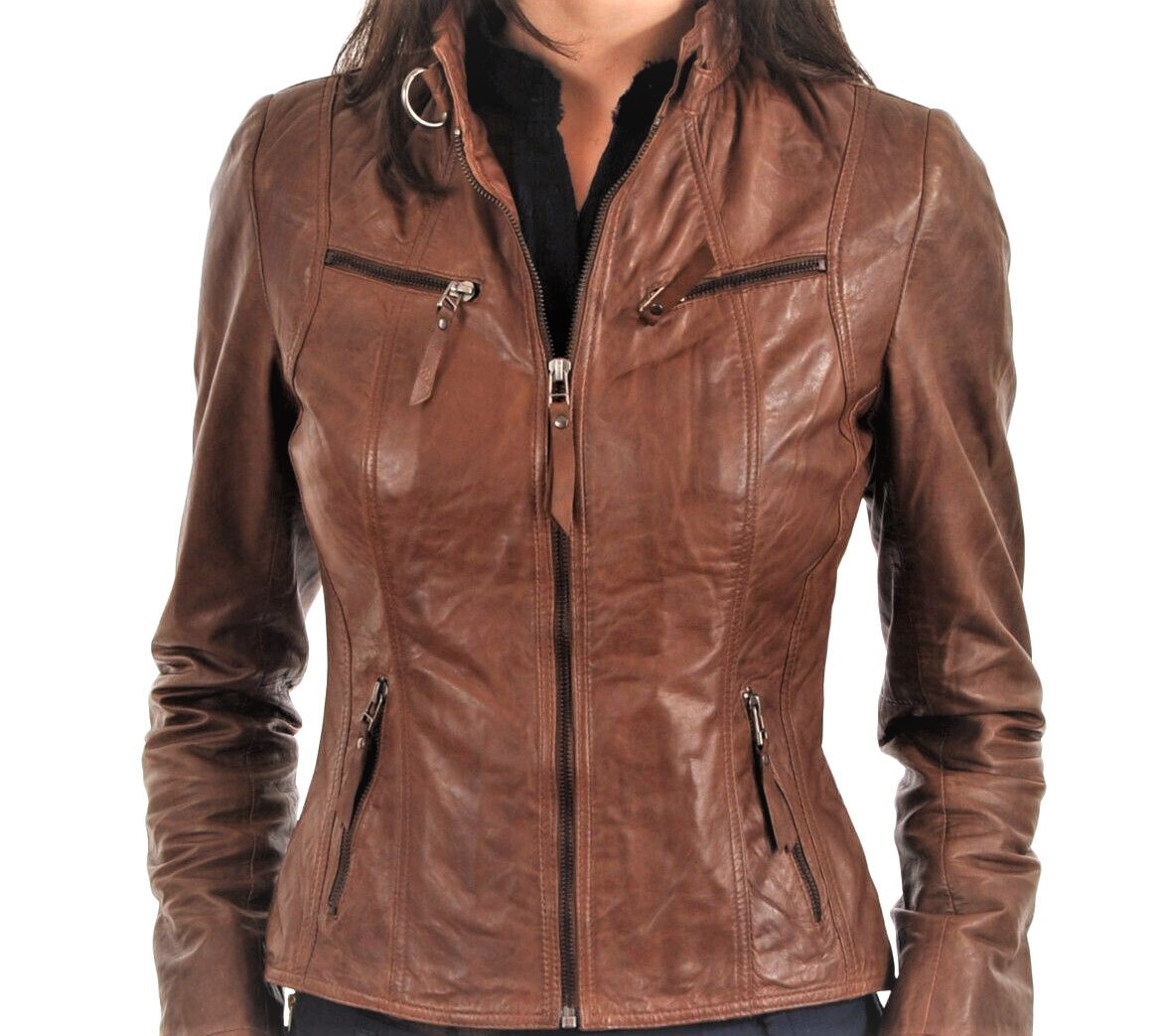 New Women Genuine Real Leather Jacket Ladies Slim Fit Biker Coat