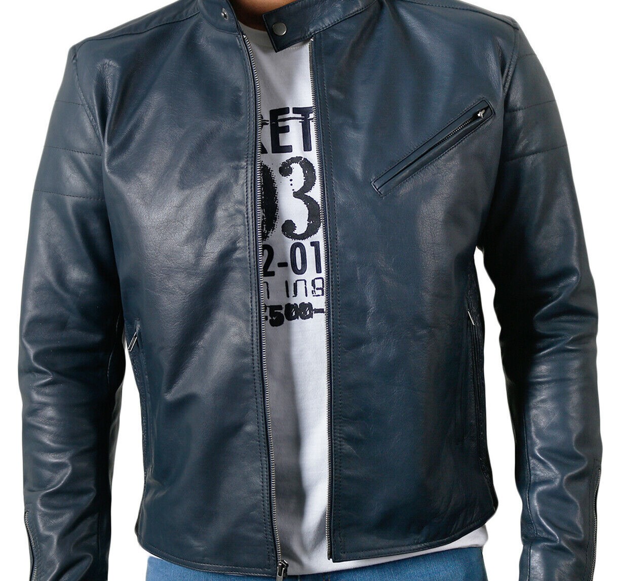 New handmade Men's Navy Blue Genuine Lambskin Leather Jacket
