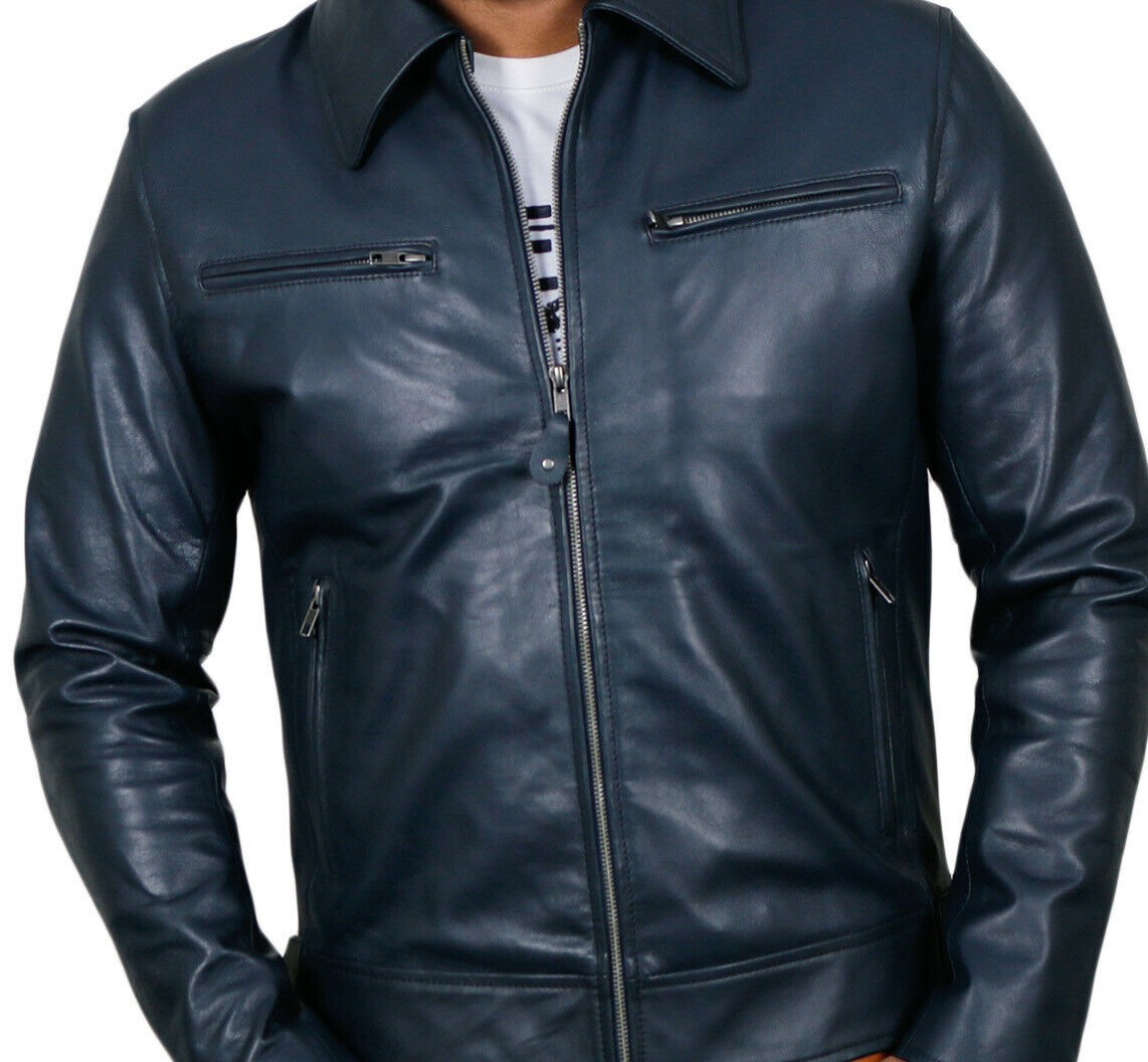 New handmade Men's Navy-Blue Genuine Lambskin Leather Jacket