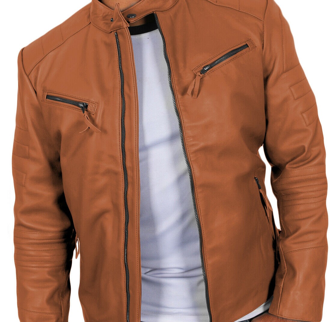 New handmade Men's Cognic Tan Genuine Lambskin Leather Jacket