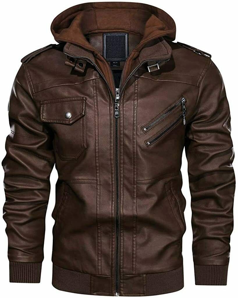 Men Leather Jacket Fall Winter Vintage Motorcycle Biker with Removable Hood