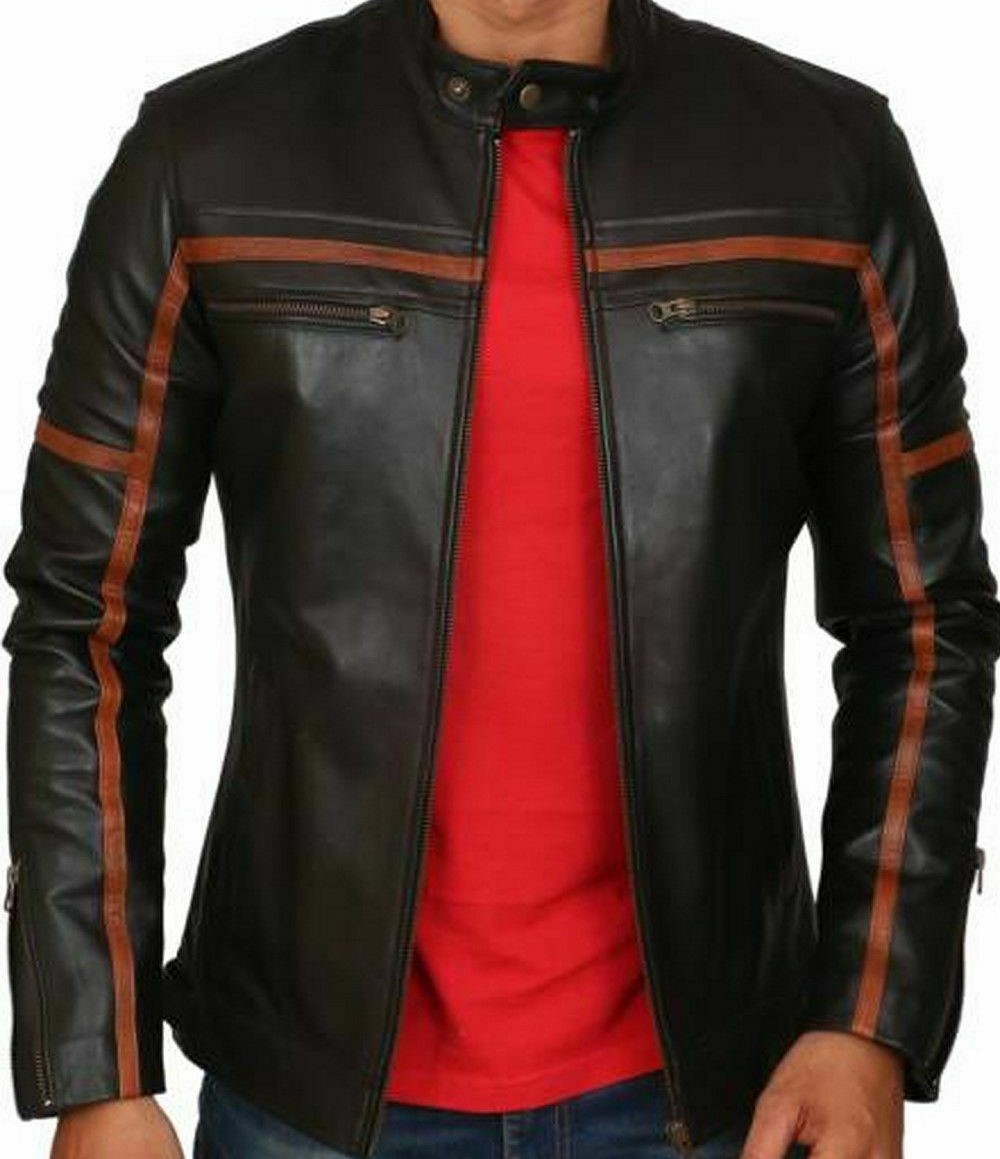 Men Stripe Line Jacket Genuine Lambskin Leather Handmade Biker Motorcycle