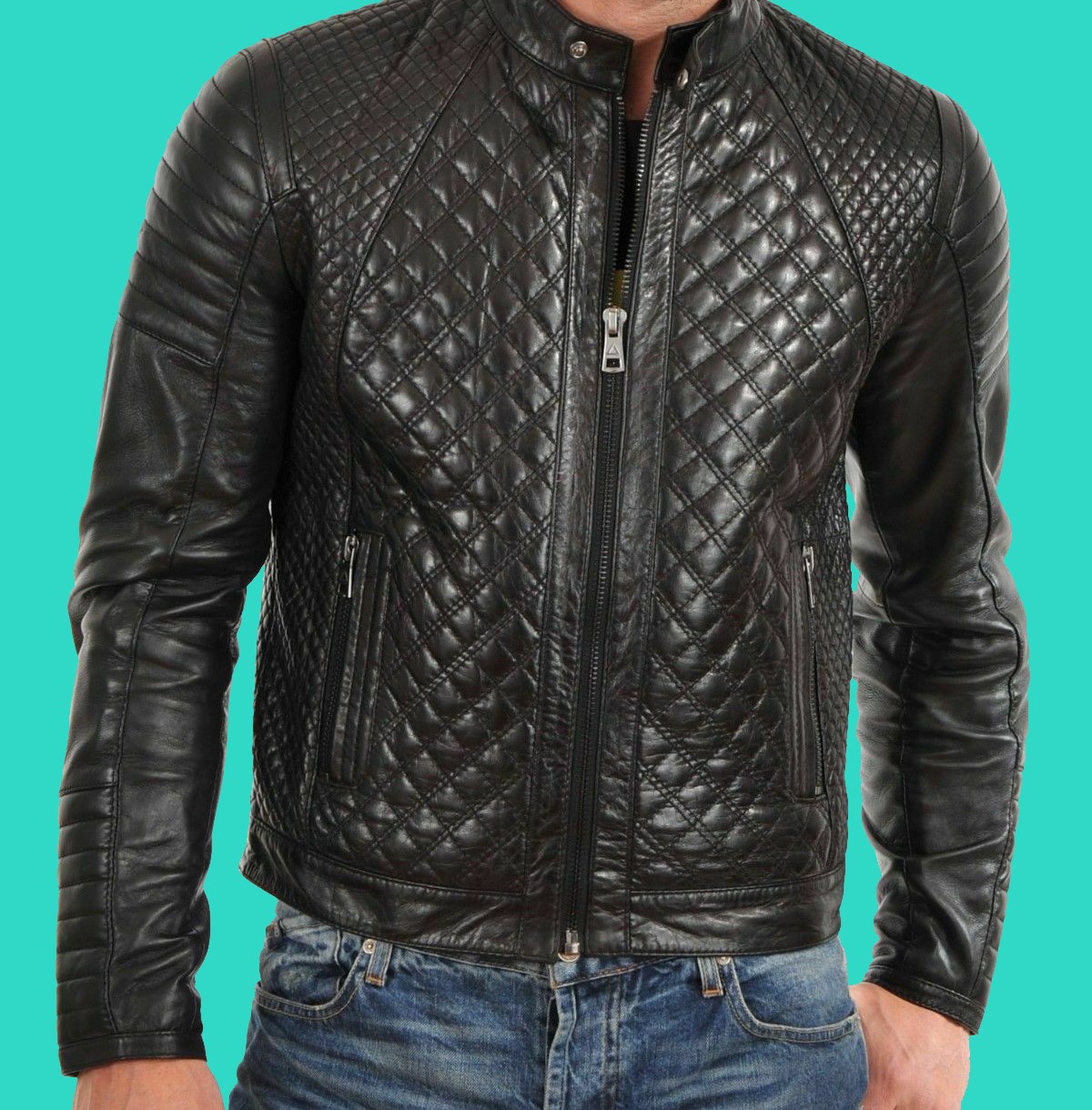 Men's Black Quilted Leather Jacket Biker Motorcycle Soft Lambskin Jacket