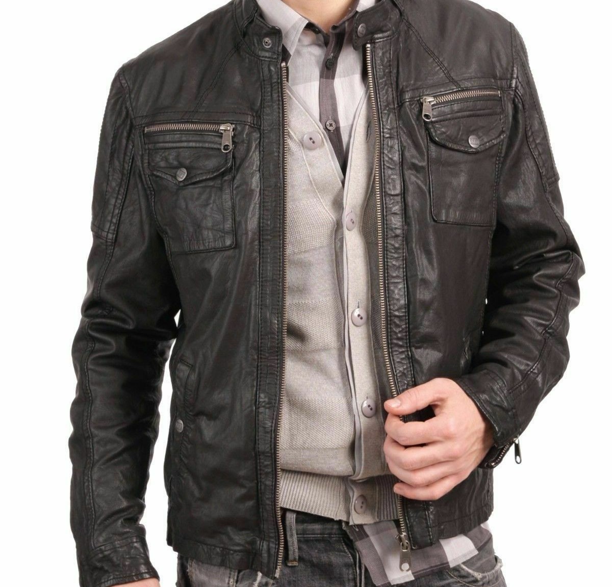 Men's Real Lambskin LeatherJacket Biker Jacket Motorcycle Style Black