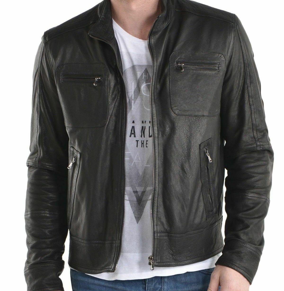 Mens Real Leather Jacket Coat Motorcycle Biker Jacket Classic
