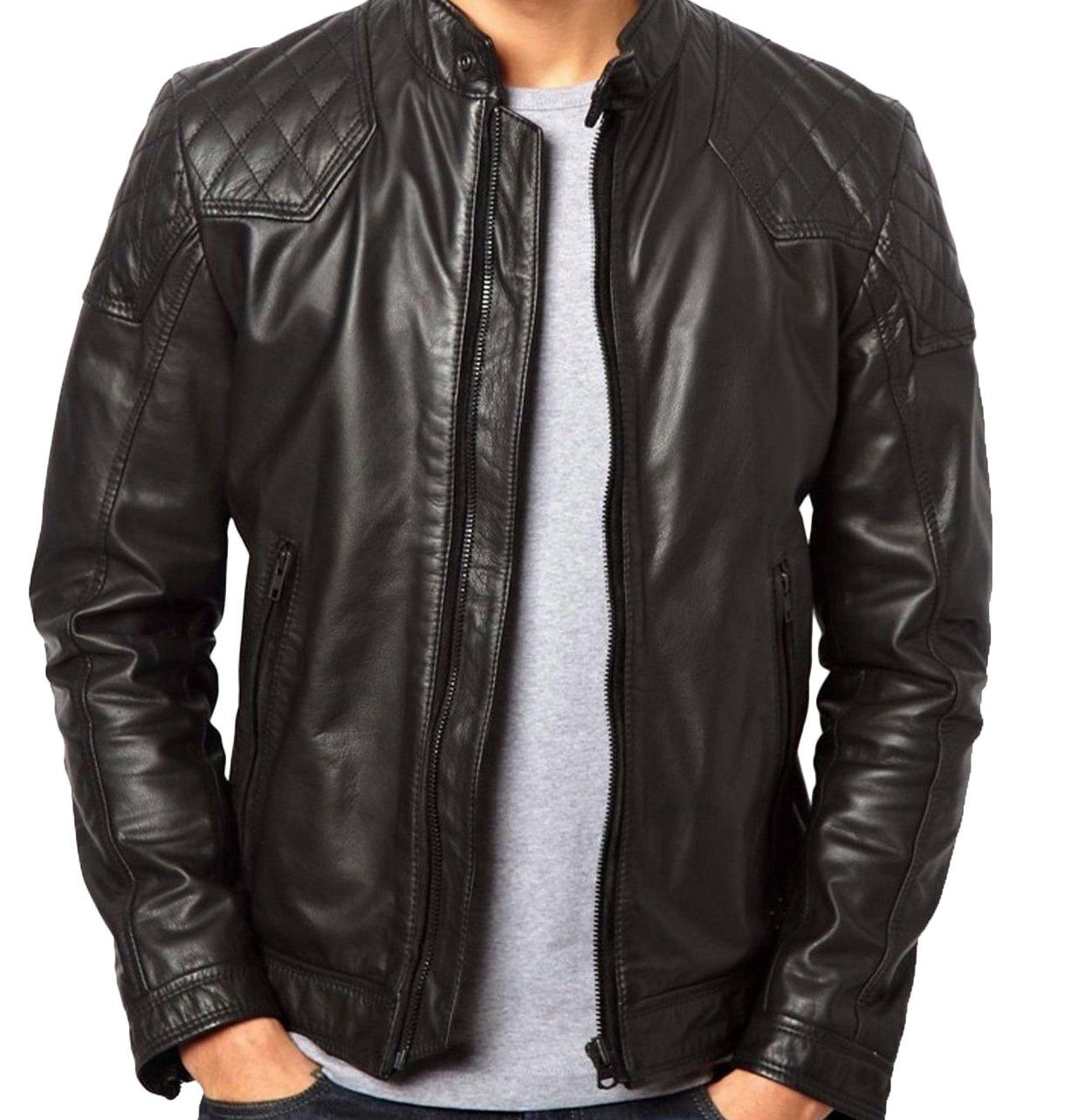 Men Slim Fit Biker Motorcycle Lambskin Leather Jacket Coat