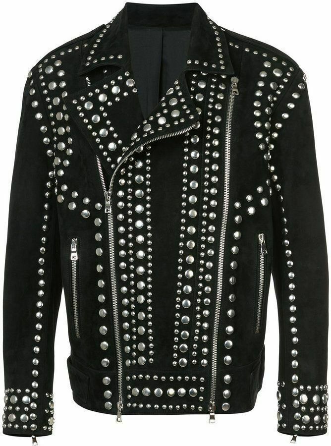 New Mens Black Full Silver Studded Rivets Brando Zipper Suede Jacket, Men jacket