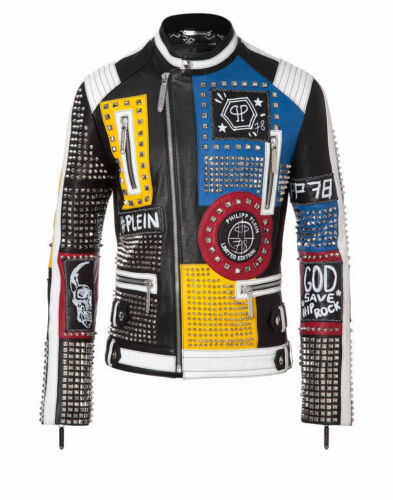 Mens Punk Style Studded Genuine Leather Jacket Plein Rock Real Leather Jacket