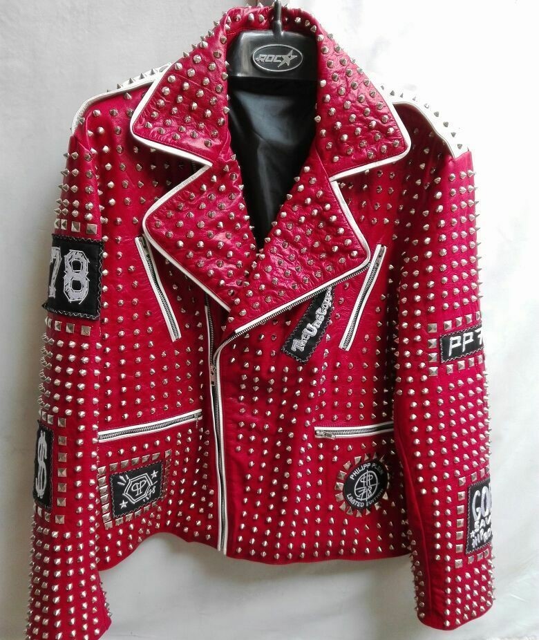 Mens Red Rock Style Studded Fashion Leather Jacket Silver Studs Jacket