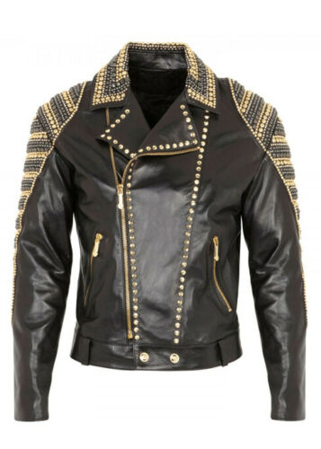 New Men's Black Golden Silver Studded Zippered Classic Cow Biker Leather Jackets