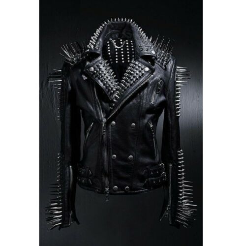 Long Spiked Punk Heavy Metal Silver Studwork Luxury Genuine Leather Men Jacket