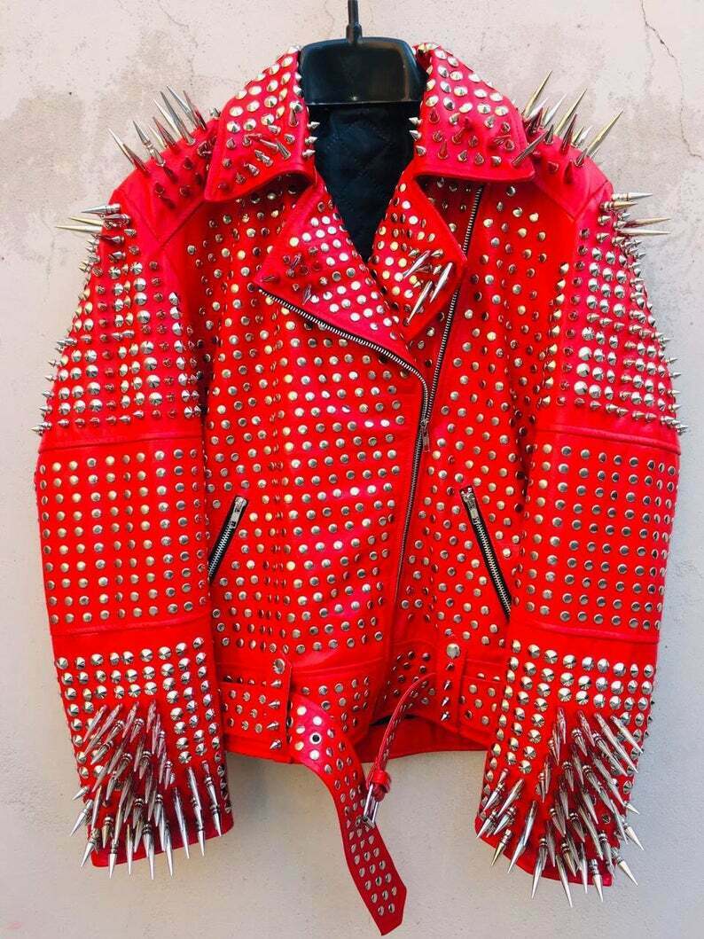 Innovative Red Men Genuine Leather Punk Style Silver Cone Studwork Metal Jacket