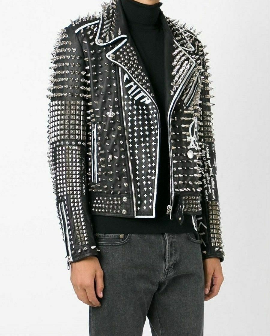 Mens Handmade Fashion Jackets Real Silver Studs White Lining Pure Soft Leather