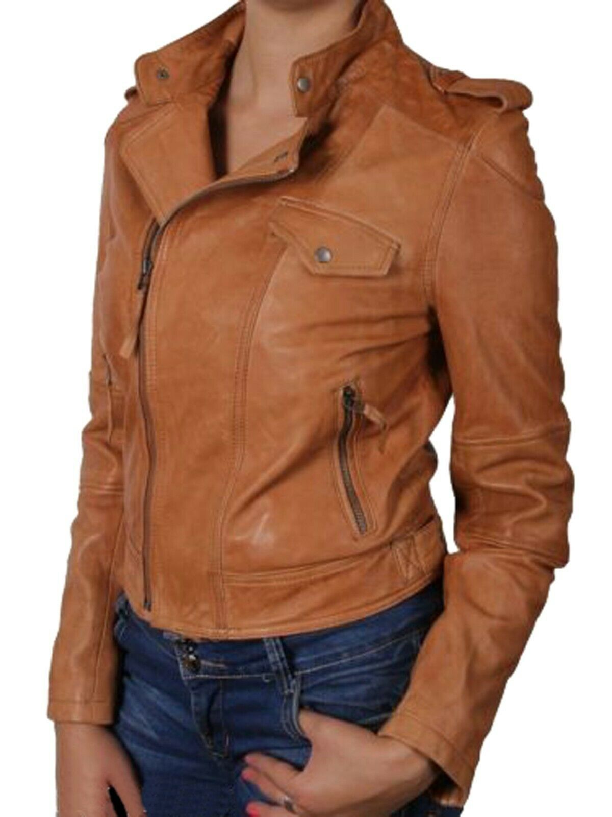 New Women Genuine Real Leather Jacket Ladies Slim Fit Biker Coat