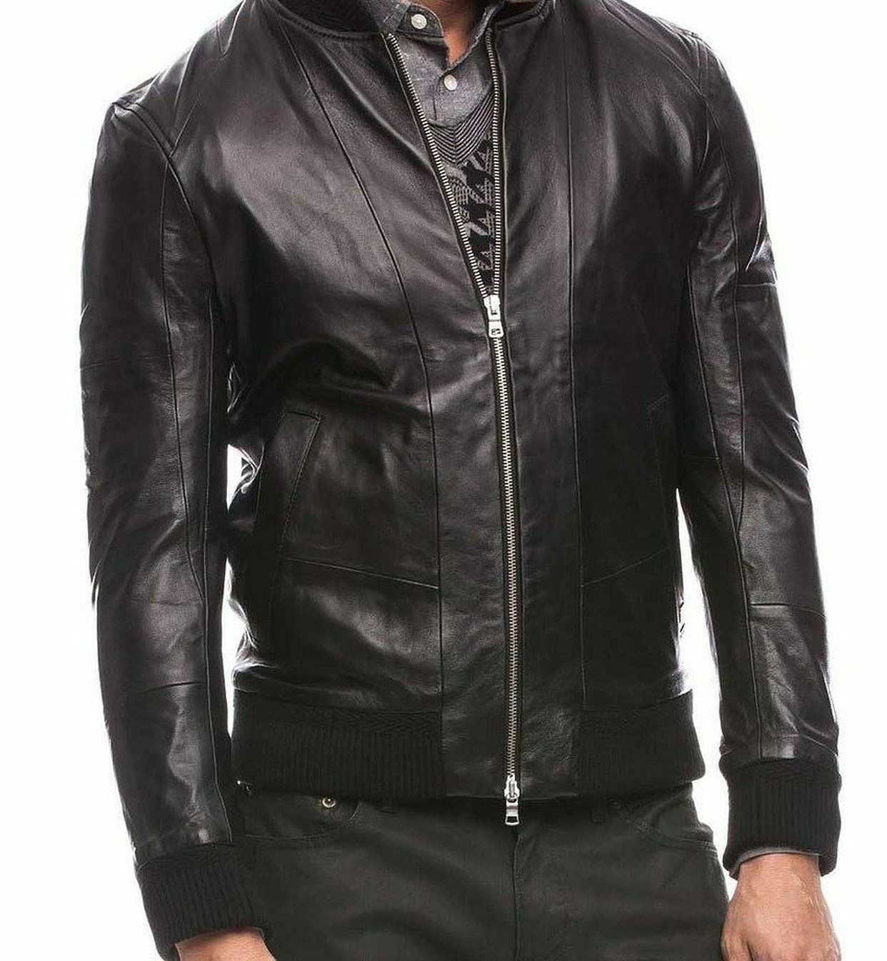 Black Leather Jacket Men Flight Bomber Pure Lambskin Slim