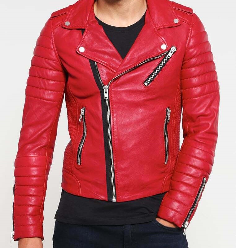 Mens Red Lambskin Leather jacket Biker Moto Size