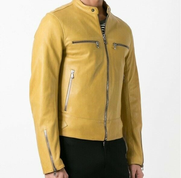 Leather Jacket Men Yellow Pure Lambskin Biker