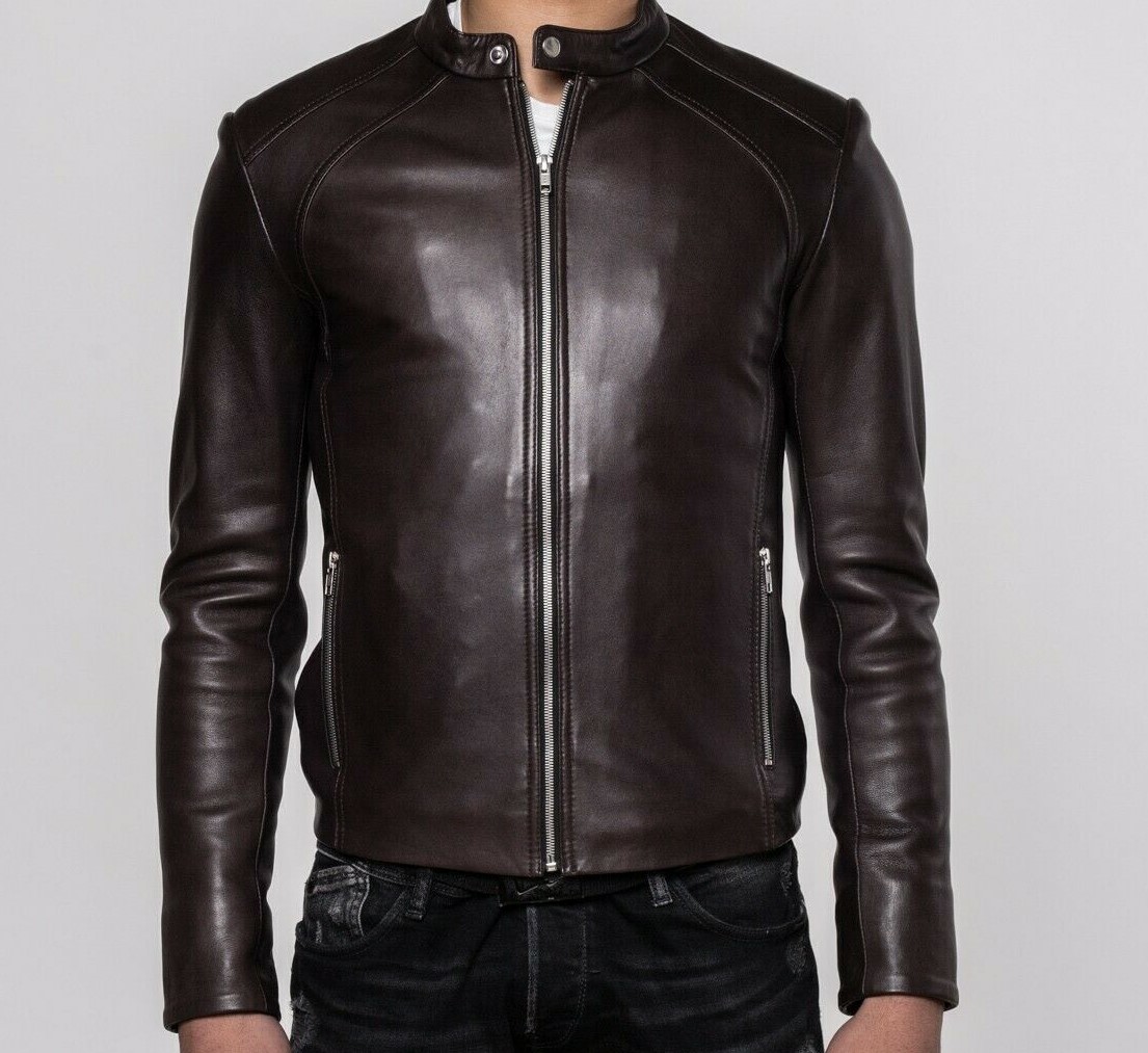 Mens Brown Leather Jacket Pure Lambskin Motorcycle Slim Fit Biker