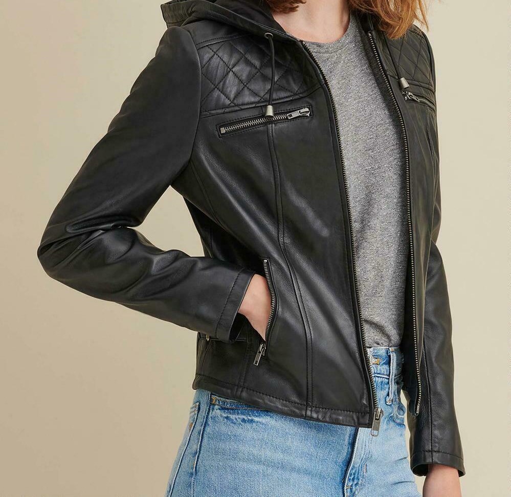 Leather Jacket Women Black with Hood Pure Lambskin