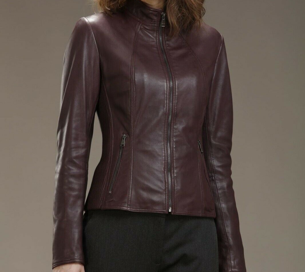Womens Burgundy Leather Jacket Biker Moto Pure Lambskin