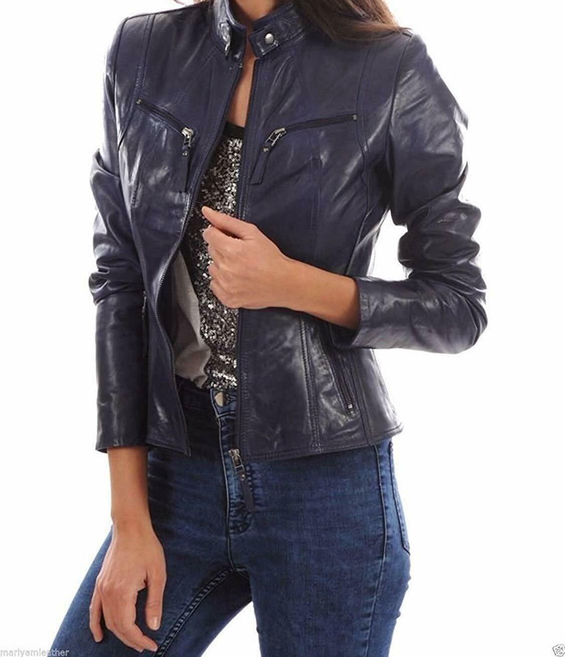 Women's Genuine Lambskin Real Leather Jacket Biker Blue Slim Soft High Quality