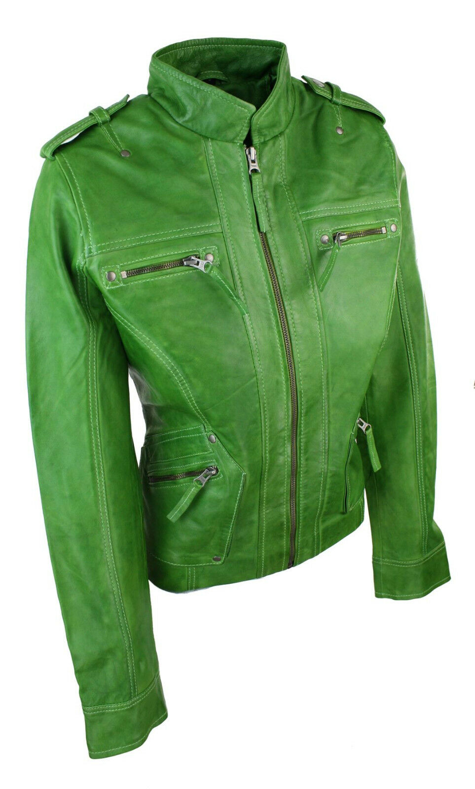 Womens Genuine Lambskin Real Leather Jacket Biker Slim Motorcycle Green Jacket