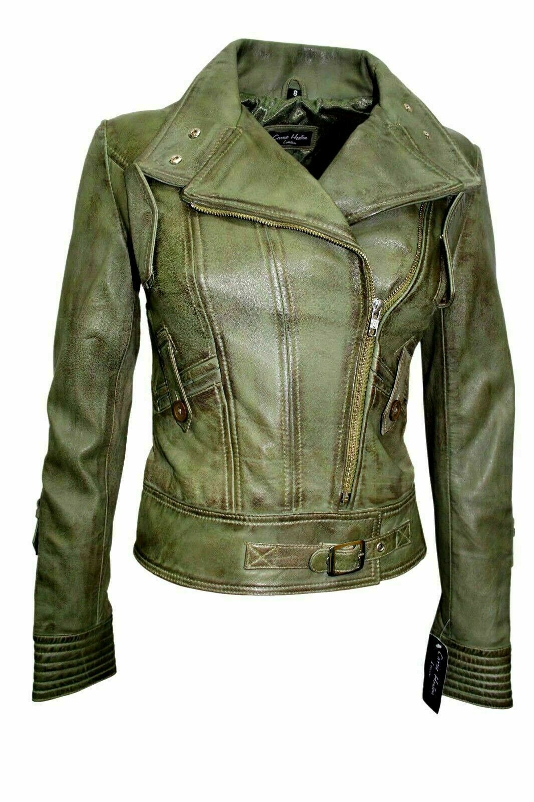 Women Genuine Sheepskin 100% Leather Jacket Biker Stylish Distressed Green Coat