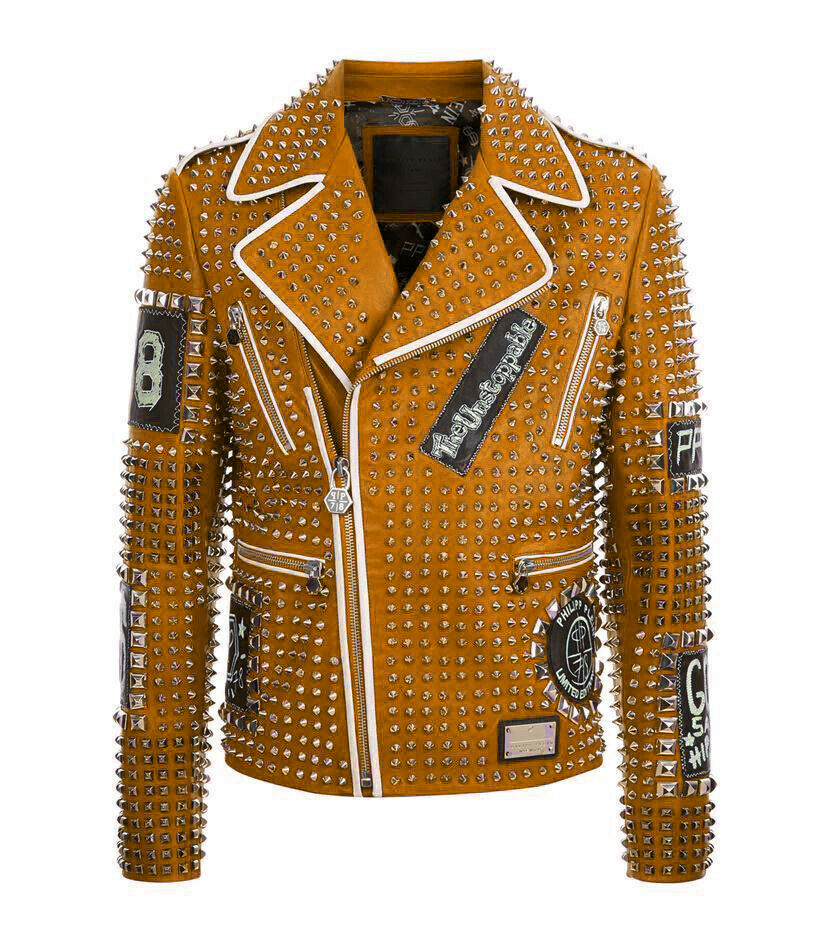 Handmade Philipp Plein Men Studded Patches Real Leather Brando Jacket
