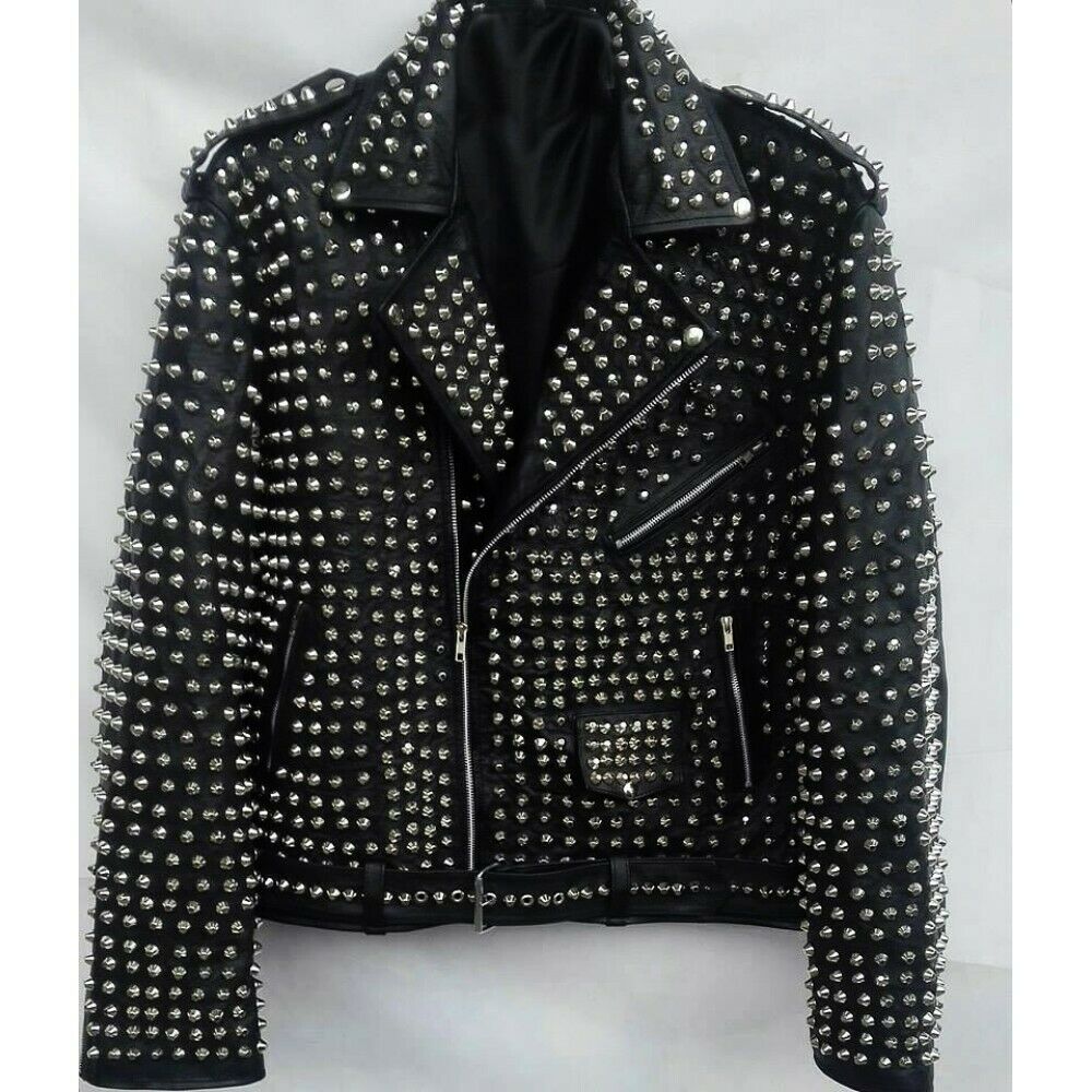 Men Black Color Silver Studs Handmade Leather Heavy Metal Biker Brando Jacket