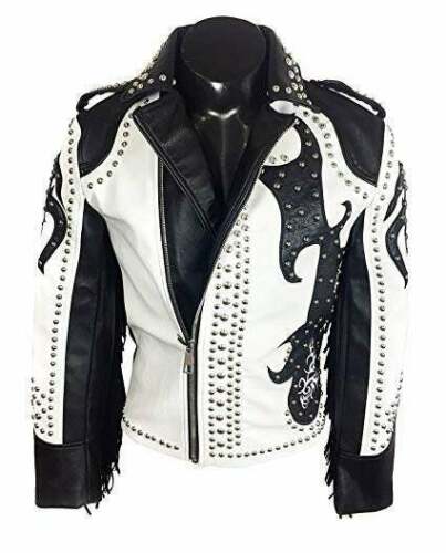 Handmade Bikers White Black Collar Studs Pure Leather Men Fringes Zipper Jacket