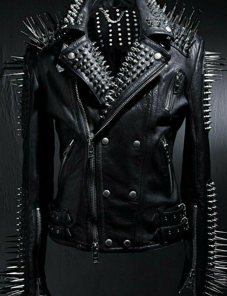 Bikers Heavy Extreme Spikes Zipper And Button Real Leather Men Punk Studs Jacket