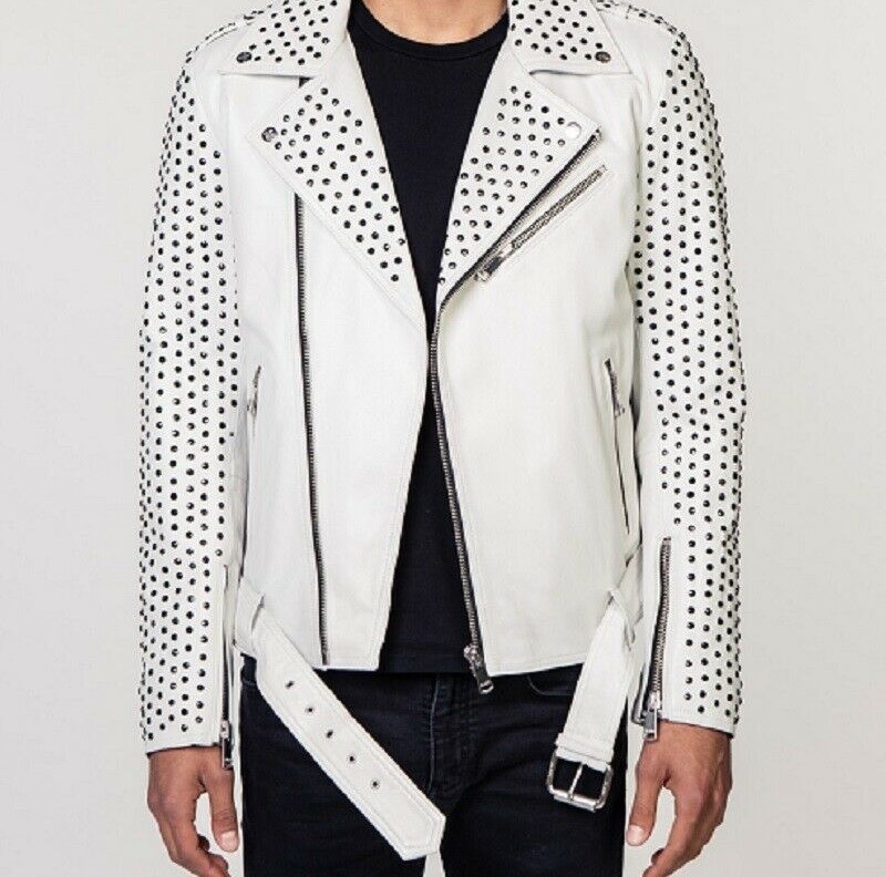 Men White Color Genuine Leather Brando Style Silver Studded Biker Belted Jacket