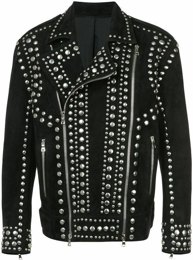 New Mens Black Full Silver Studded Rivets Brando Zipper Suede Leather Jacket