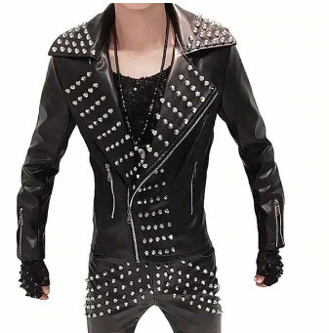 Handmade Men's Studded Leather Jacket with Silver Studs,Rock Style Leather new