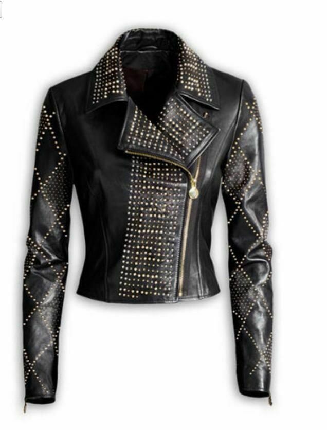 Handmade Woman Black Color Silver Golden Studded Brando Style Leather Jacket