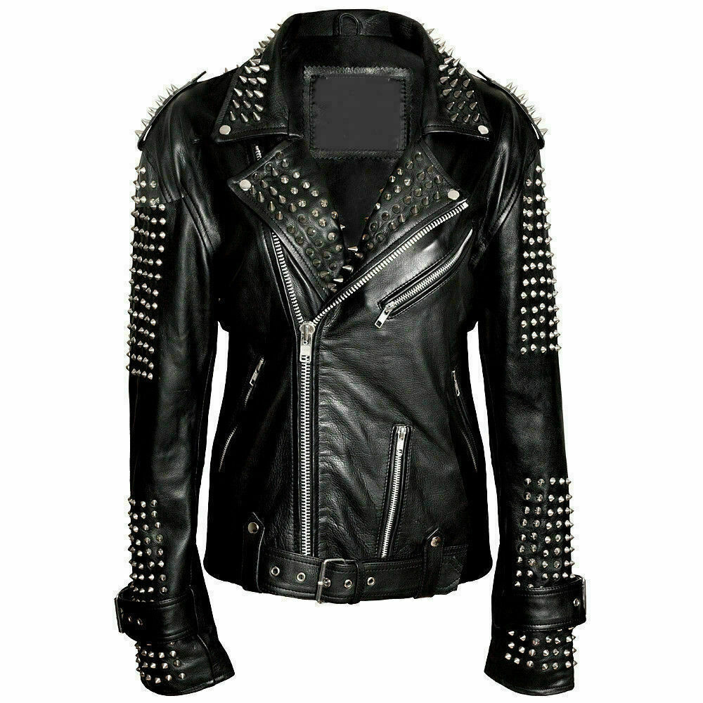 Handmade Men's Black Punk Half Silver Studded Black Motorcycle Leather Jacket