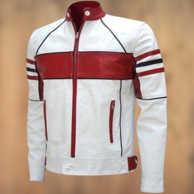 Men Stylish Cafe Racer Black and Red Stripe Distressed white Genuine Leather Jacket