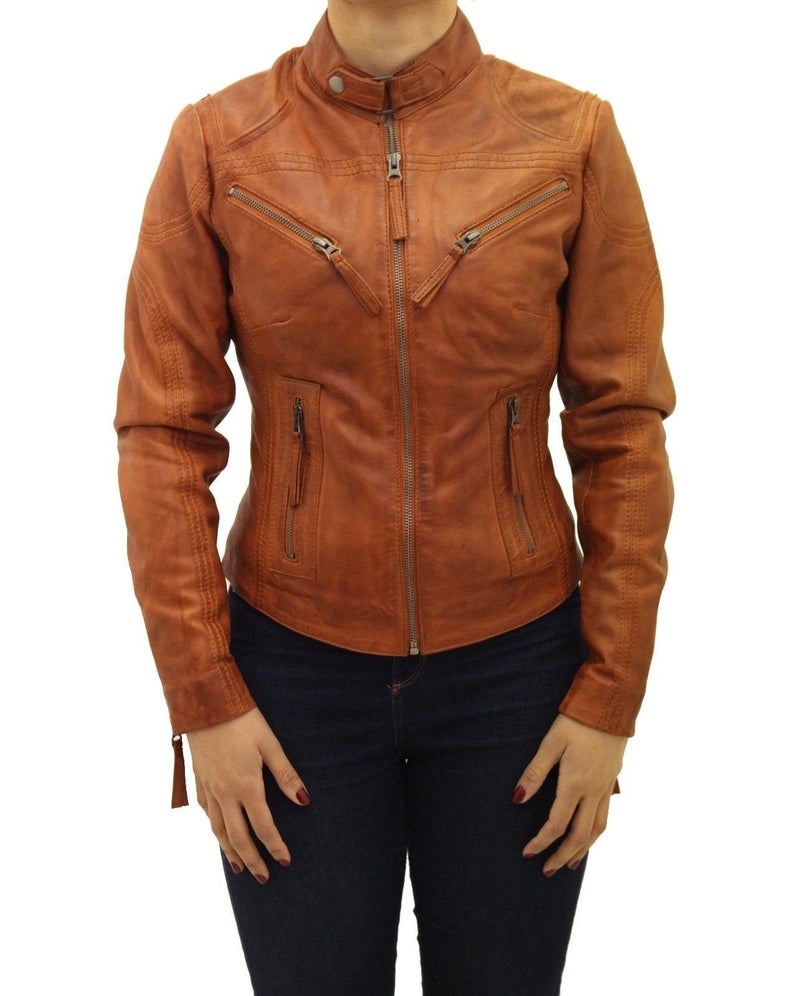 Ladies tan or black real leather fitted smart short zipped biker collarless jacket