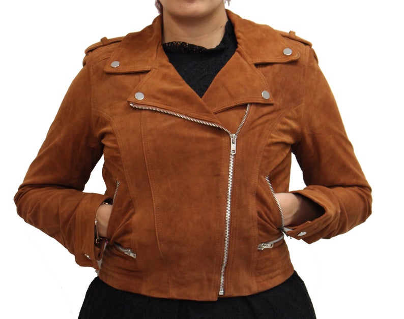 Womens Suede lightweight real leather Brando style cross zip biker jacket. Available in Black, Brown and Tan