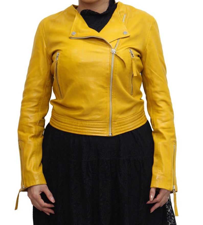 Womens lightweight summer cross zip biker jacket with classic zipped sleeves. Available in Black and Yellow