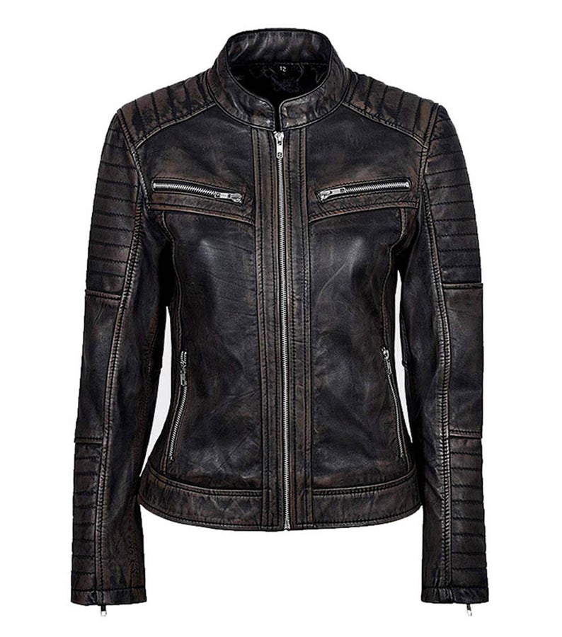 Rub Off Vintage Distressed Black Trendy Leather Jacket for Women