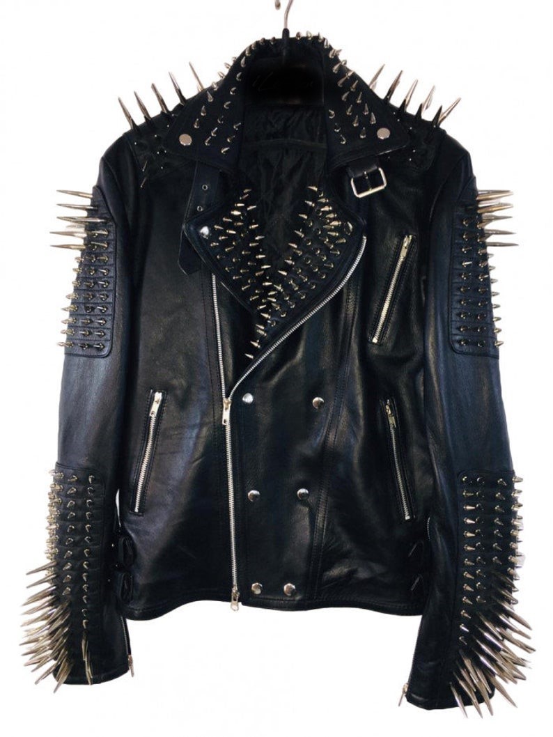 Handmade Men's Black Fashion Long Studded Punk Style Leather Jacket
