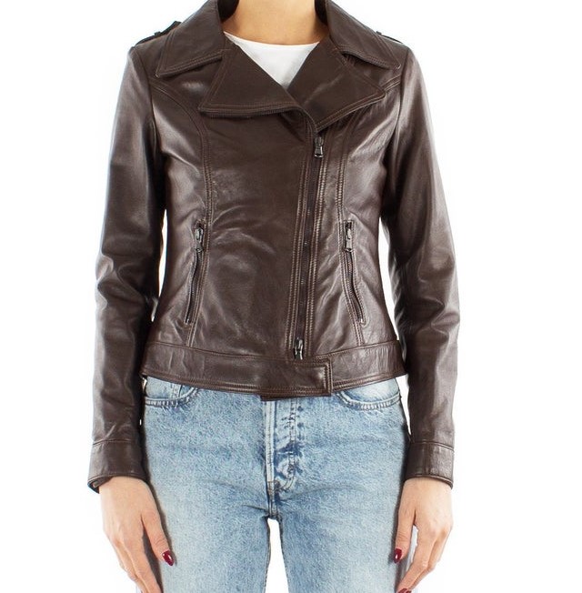 Women genuine soft Lambskin lamb leather biker jacket slim fit Dark Brown