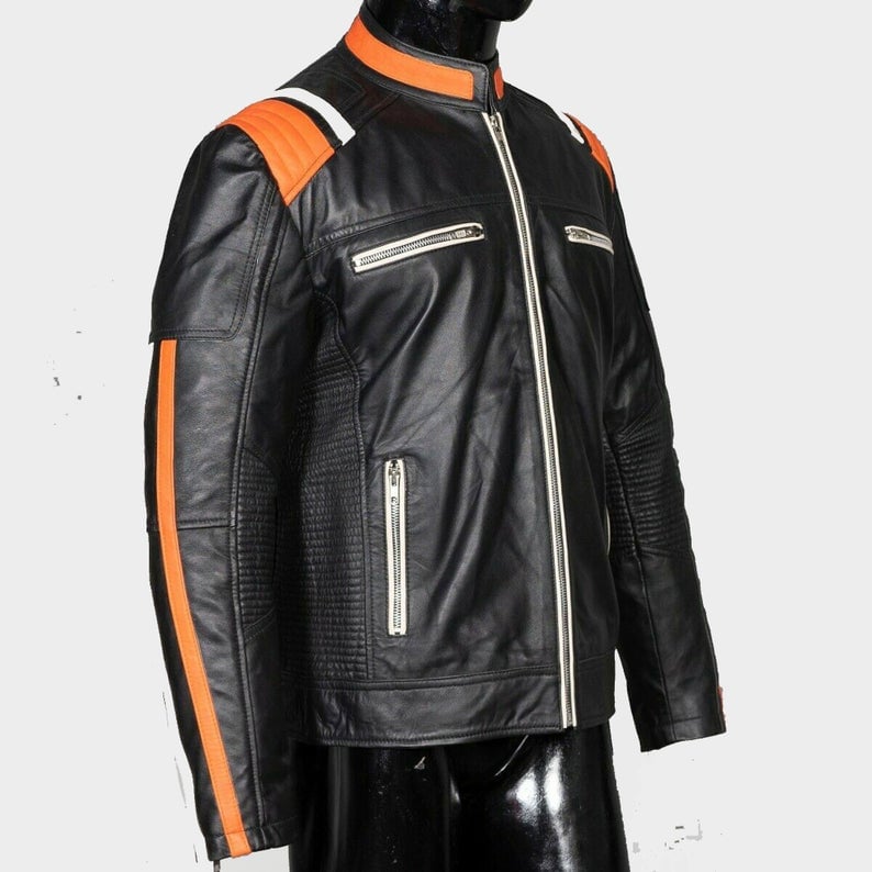 Mens Fashion Black Orange & Beige straps Leather Biker Jacket,Mens Biker Leather Jacket