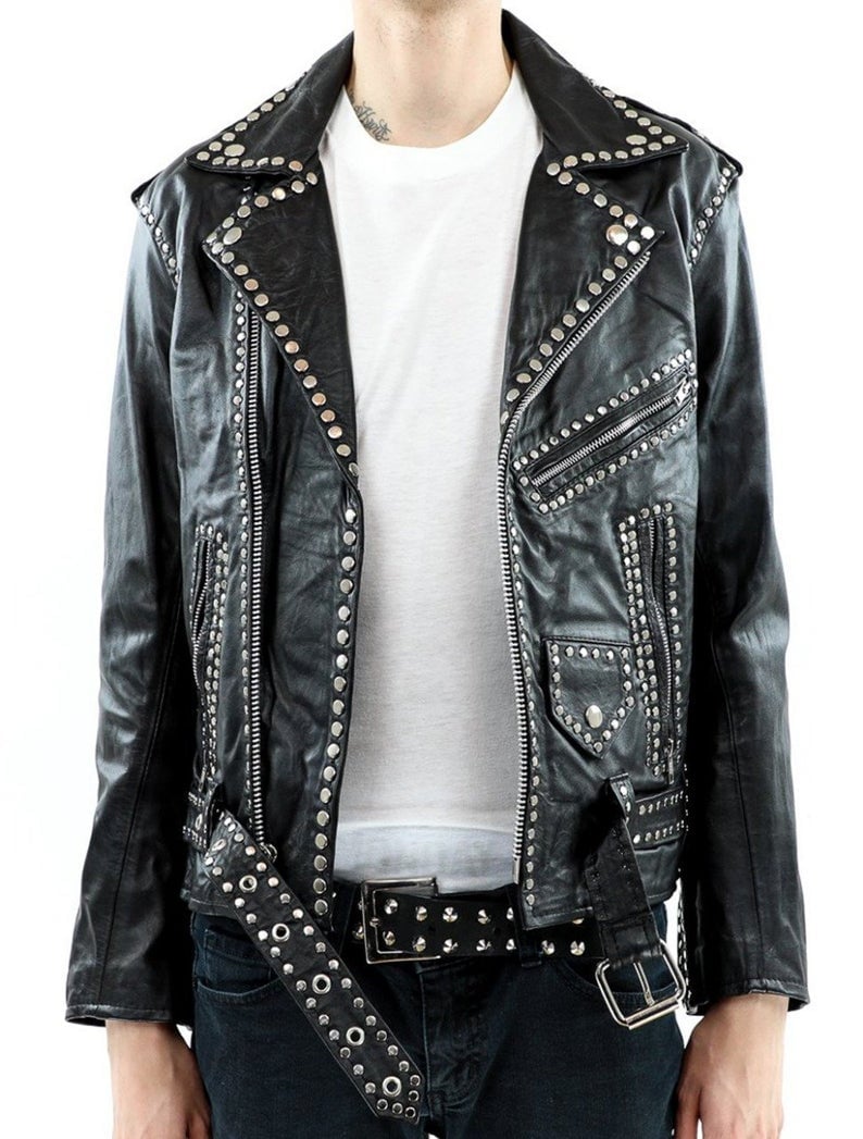 Men Silver Studded Jacket Black Punk Silver Spiked Leather Belted Biker Jacket Side Zipper Pockets Spiked Studded Leather Jacket
