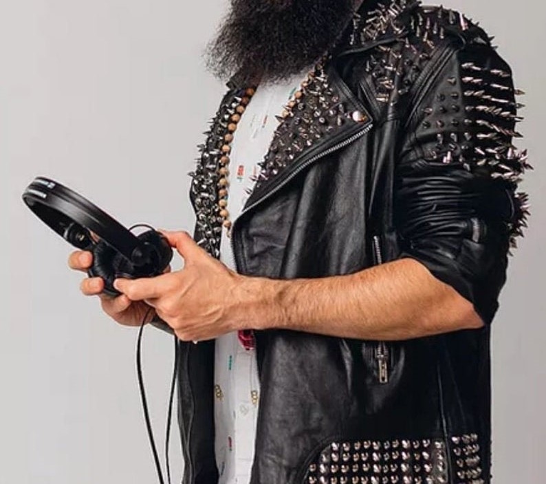 Rockers Men Black Punk Silver Studded Leather Jacket Buttons Up Silver Studs and Spikes Black Leather