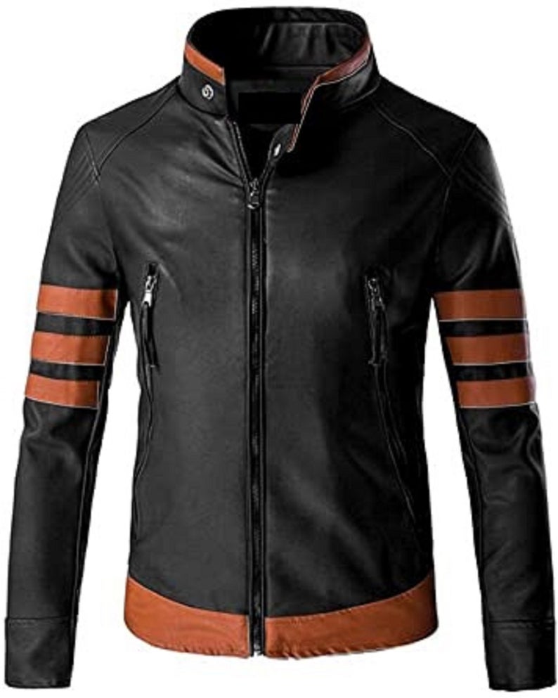 Men's Lambskin Black Jacket with Tan Brown Color Strips Biker