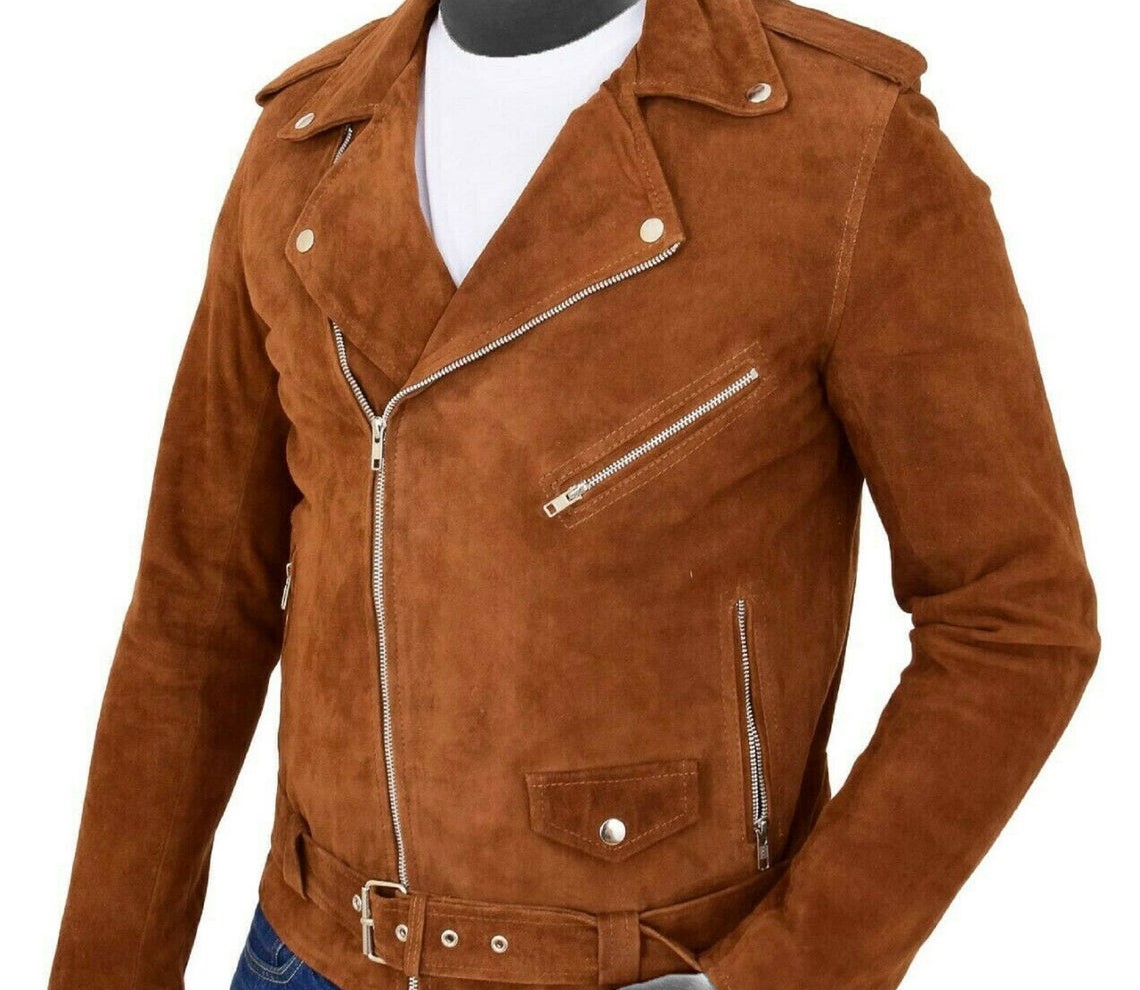 Handmade Men's Stylish Biker Motorcycle Lightweight Dark Tan Real Suede Leather